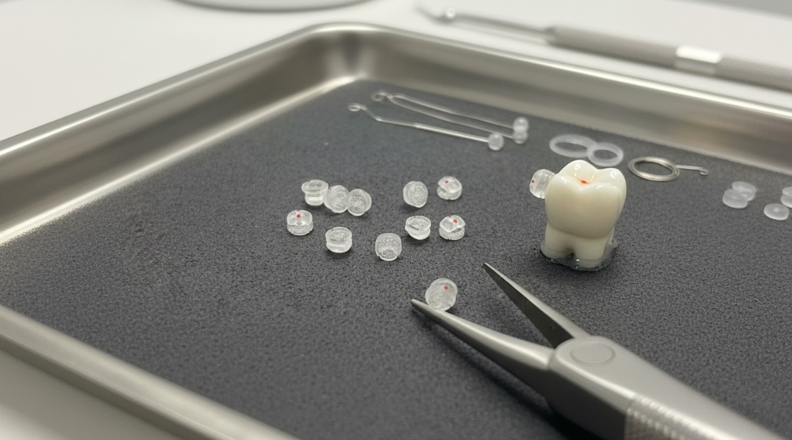 Les boutons à coller en résine offrent une fixation fiable et esthétique pour élastiques, chaînettes et systèmes d’ancrage. Leur conception professionnelle assure confort et durabilité tout au long du traitement.