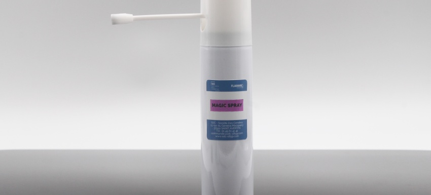 Spray d'occlusion. Vaporiser sur le modèle en plâtre, mettre la chape dessus, permet de voir les points de contact gênants afin d'y remédier. Sèche en quelques secondes après la pulvérisation. Utilisable pour passer au scanner. Très fin. Facile à retirer.